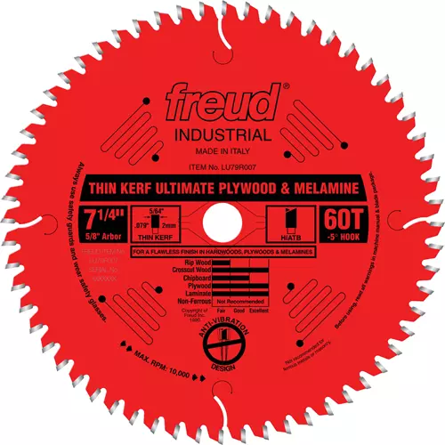 Using advanced technology, Freud developed the LU79 thin kerf line of saw blades that features laser-cut, anti-vibration slots that practically eliminate the vibrations that resonate in standard blades. This blade provides flawless, chip-free edges in veneered plywoods, fine moldings, melamine, laminates, and crosscuts in solid woods. The combination of Hi-ATB tooth design and anti-vibration slots makes these thin kerf blades the ultimate finish blades. The result is a cut so smooth it eliminates the need for a stabilizer or a scoring blade!