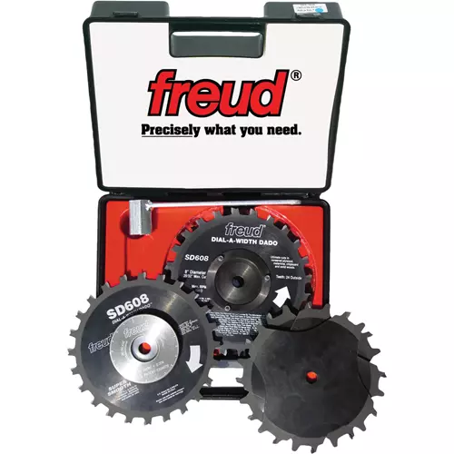 Set includes 2 outside blades, 5 chippers, wrench and carrying case Adjusts in .004" increments Features Premium TiCo™ HI-Density Carbide Crosscutting Blend for Maximum Performance Silver I.C.E. Coating prevents build up on the blade surface and keeps the blade running cooler and cleaner All blades and chippers come with Freud’s anti-kickback design