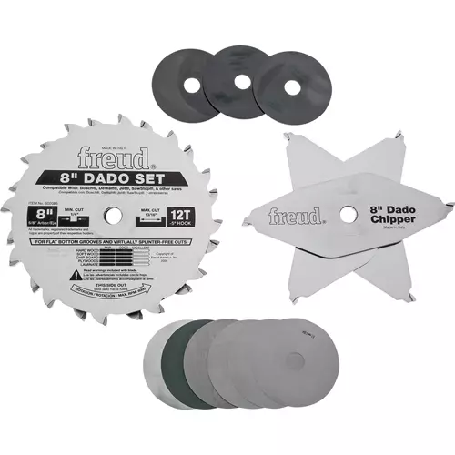 Freud's quality and craftsmanship in a stacked dado set, but at a wobble dado price! The negative hook angles make flat bottom grooves and virtually splinter-free cuts. It has two outside blades with three two wing chippers. This makes it ideal for underpowered saws because it requires less power to feed. All blades and chippers come with Freud's anti-kickback design. This resharpenable set will produce grooves from 1/4" to 7/8". This dado set comes with a shim set and carrying case as well as instructions on how to make basic dado sizes. Almost identical to the T24401 blades, however these Pro series blades can be used with a saw stop table saw.