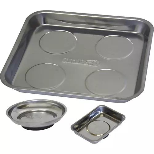 Use this handy set to keep parts and tools from being misplaced or lost while working in the garage or at the workshop. Magnetic trays prevent items from rolling or sliding and can be used at any angle. Heavy duty, bright polished stainless steel resists rust and corrosion. Includes - 9-1/2" x 10" magnetic parts tray, 4" round magnetic parts tray, and mini magnetic parts tray.