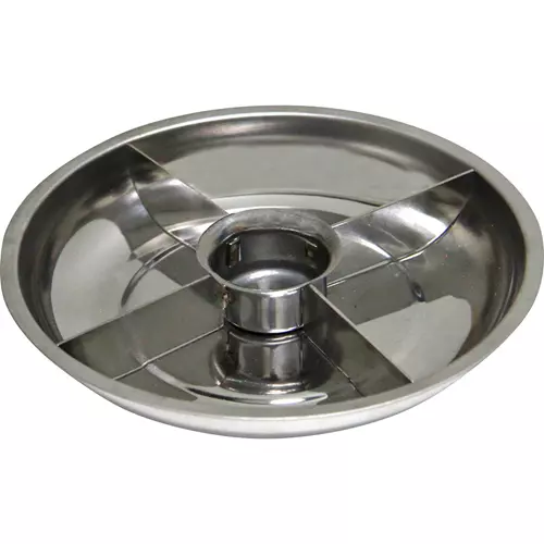 The round divided magnetic parts tray is used to store nuts, bolts, screws, and other small objects. Bowl has a rubber covered magnetic base for affixing to metal objects such as a vehicle or a toolbox. Magnetism transfers to inner surface of bowl to keep small nuts and bolts affixed, and relieve any anxiety over loss or spillage. Stainless steel mesh construction allows use in water-based cleaning tanks for small parts washing and degreasing.