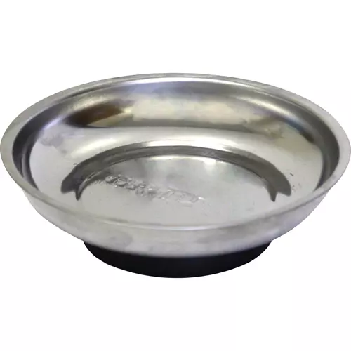Heavy gauge, stainless steel construction with smooth rolled edges. It keeps small steel parts, tools, screws, needles, and bolts in place when working on a job or project. Bright, polished stainless steel dish is easy to clean. Dimensions - 6" diameter, 1-1/8" depth.