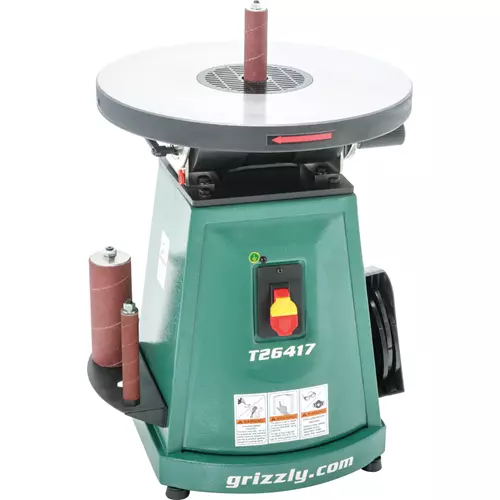 This is the only Grizzly benchtop oscillating spindle sander with an adjustable table. The 15" diameter table tilt ranges from 0° to 45°.