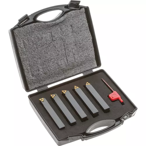 This 1/2" 5 Piece Carbide Insert Turning Set features 1/2" x 1/2" straight shanks and uses 7° relief triangle inserts. Inserts: G6707, T21588