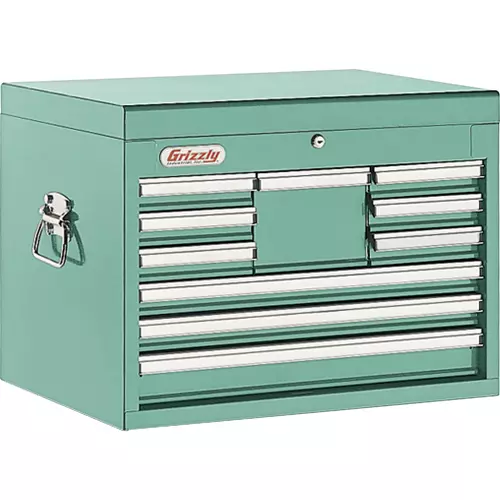 This Heavy-Duty 10 Drawer Full Depth Chest features an 18 Gauge steel body, 19 gauge steel top, bottom and drawers, quick release ball bearing slides, internal locking system and gas spring cylinder. Additional features include heavy-duty side handles, portable tool tray, protective drawer liners, powder coated paint and extruded aluminum drawer handles with PVC strips to label the contents of each drawer. Cabinet measures: 26" W x 19" H x 17-7/8" D.
