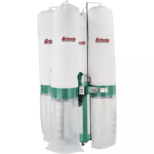 Controlling dust in a large shop can be a challenging task, but this new 10 HP dust collector will make it child's play. Features 6700 CFM air suction capacity, 21 static pressure, 0.3 micron bag filters and a five port intake manifold. Four heavy-duty plastic collection bags (with a total of 53 cubic feet of storage capacity) will easily allow you to collect from the biggest chip and dust producing machines all day long without emptying. Warning: Keep small animals clear of intake openings--this dust collector is extremely powerful!