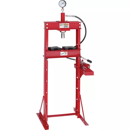 For your pressing needs, this 10 Ton Floor Model Shop Press features a maximum 35-1/4" distance under the ram with 7 adjustable bed locations at 6" on center and a 5-3/8" stroke. Bed dimensions are 16-1/2" wide by 7" deep. A large pressure gauge tells you how much pressure is being applied and a horizontally mounted hydraulic pump delivers precise pressure to the cylinder. Includes 2 arbor plates. Overall size is 26" W x 19-3/4" D x 64-1/2" H. Approximate shipping weight: 148 lbs.