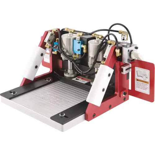 The jig uses pneumatic power to reliably hold the workpiece and provide a cushion of air, making movement on the table easy.