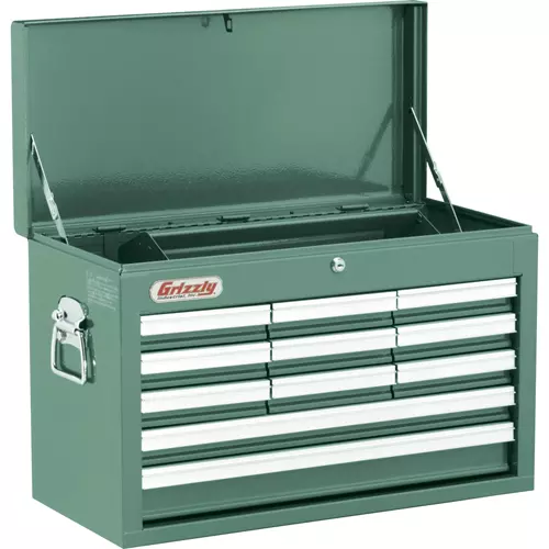 This Heavy Duty Drawer Chest features 11 drawers, scissor lock lid supports, lid activated drawer locks, adjustable dividers for top compartment and heavy duty side handles.