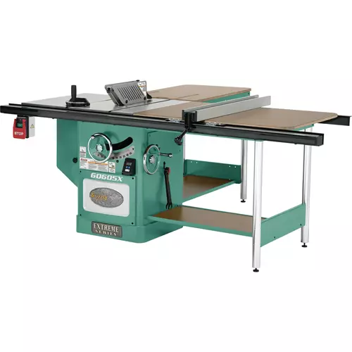 This Extreme Table Saw is ideally suited to handling large panels without blinking an eye. A right-hand & rear mounted extension table supports the widest panels before, during and after the cut and the large rail mounted switch control won’t get lost under the panel. Other features include ample storage shelves, a user friendly blade guard, a riving knife, a digital readout for blade angle & an efficient dust management system that includes an internal dust port & a sloped cabinet floor that directs saw dust into the 4" dust port. Enjoy all of the innovative features this big capacity saw has to offer