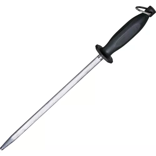 This 12" Knife Sharpener efficiently sharpens both sides of the knife blade for a razor sharp edge. Large plastic guarded handle protects hands and won't damage the cutting edge. Knife sharpener includes hanging loop and measures 17-1/2" overall.
