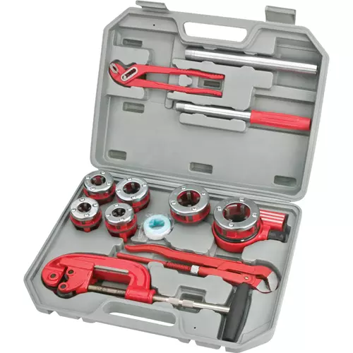 In addition to a pair of rugged adjustable wrenches and a heavy-duty pipe and tubing cutter, this complete kit includes a reversible ratcheting die handle and dies for 1/4", 3/8", 1/2", 3/4", 1" and 1-1/4" pipe.