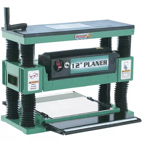 Over 13 years of trial, testing and serious abuse in the field has proven what we've known all along - this 12" planer is about the toughest, most dependable portable on the market. Available only through Grizzly, this 2 H.P. planer provides 55 cuts per inch, so you'll enjoy smoother cuts that require very little surface sanding. And it's light enough to carry right to the jobsite! Sound too good to be true? American Woodworker rated this machine a Best Buy and Wood Magazine rated it a Top Value in their independent reviews of comparable products. We have carried this machine for 13 years and it is the heaviest 12" planer on the market. Knife setting jig included.