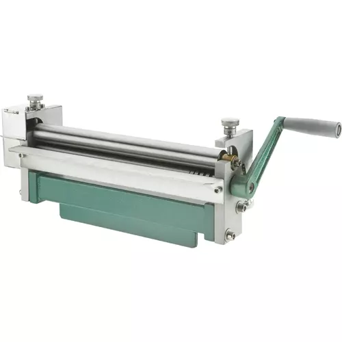 The slip roll has a hand crank on one end that the operator uses to rotate the rollers as they feed the sheet metal into the slip roll.