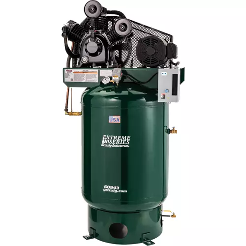 The Grizzly PRO G0943 120-Gallon 10 HP Extreme Series Air Compressor designed for commercial shops where large air volume is needed with a maximum pressure of 175 PSI.