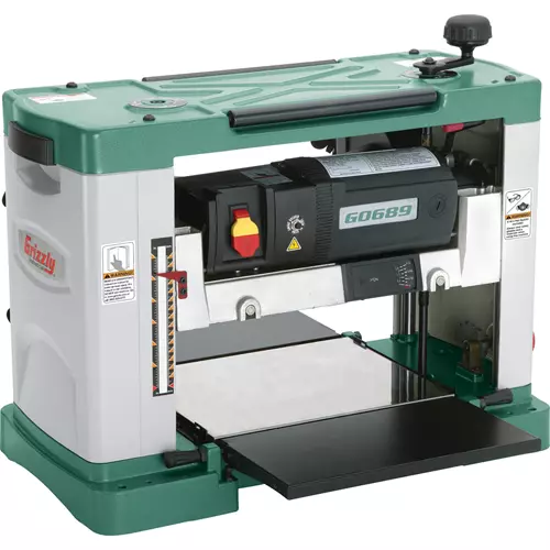 At home, at the job site, or in the workshop, this 13" Planer will go anywhere you need it. Features include four column support, easy-to-set double sided HSS blades, right and left handed height control knob option, material removal height gauge, stepped material thickness presets, cutterhead height lock lever, double return rollers, thermal overload protection and dust collection bag. Two built-in side handles and adjustable, flip up table wings make this planer a compact 26" wide x 20-1/2" high x 13-1/2" deep for easy portability.