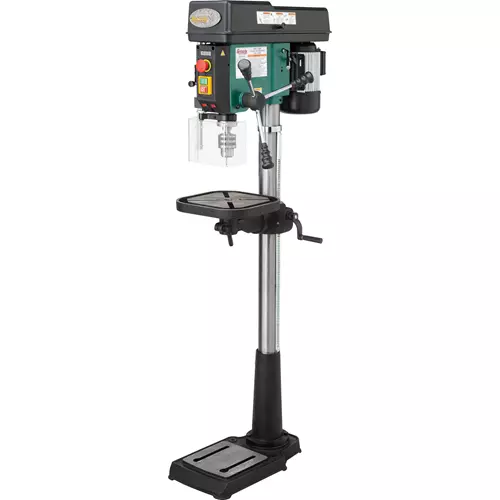 This floor variable-speed drill press also includes four 5/8" T-slots and a clear chip guard for protection from debris.