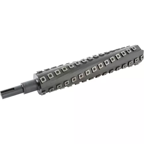 The indexable carbide inserts are positioned along a helical pattern with the cutting edges at a slight angle to the workpiece for a shearing action that leaves a glassy smooth cut even on the toughest of woods.