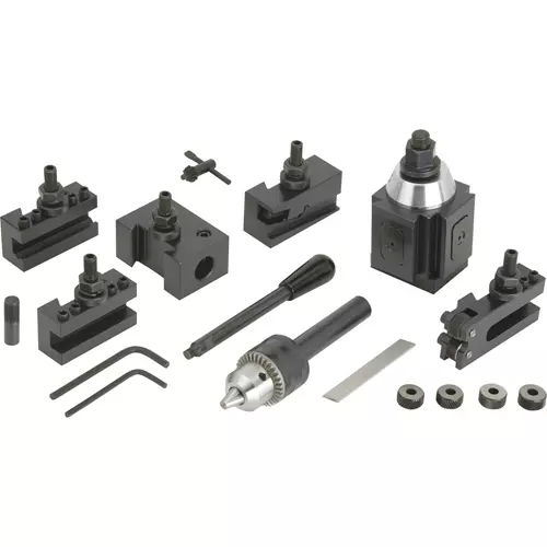The T10166 17-Piece Quick Change Tool Post Set is case-hardened and coated with a black oxide finish for long life and repeatable accuracy.