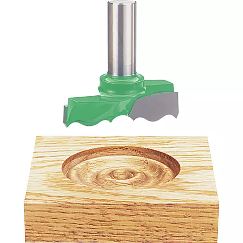 Milled from a solid steel blank, this carbide-tipped, 1/2" shank rosette cutter makes crisp rosettes in most hardwoods and softwoods. Please note, although this cutter looks like an oversized router bit, it is too big for normal router speeds and are designed for use with your variable-speed drill press or lathe. Max RPM: 15,000.