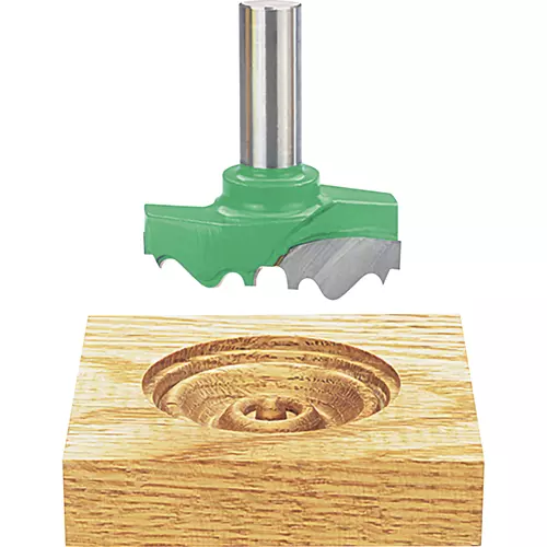 Milled from a solid steel blank, this carbide-tipped, 1/2" shank rosette cutter makes crisp rosettes in most hardwoods and softwoods. Please note, although this cutter looks like an oversized router bit, it is too big for normal router speeds and are designed for use with your variable-speed drill press or lathe. Max RPM: 15,000.