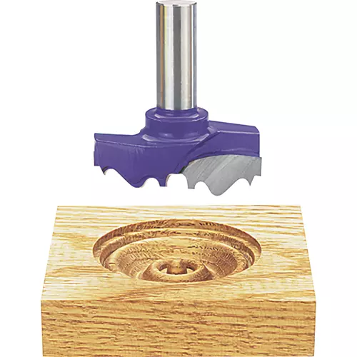 Milled from a solid steel blank, this Grizzly® carbide-tipped, 1/2" shank rosette cutter makes crisp rosettes in most hardwoods and softwoods. Please note, although this cutter looks like an oversized router bit, it is are too big for normal router speeds and is designed for use with your variable-speed drill press or lathe.
