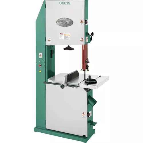 This 900 pound beast can chew through any species of wood that will fit into its 16" vertical capacity, 22-7/8" throat. Dual-belt driven wheels ensure consistent 5200 F.P.M. performance and blades ranging from 1/2" to 2" can be mounted. A strategically placed 4" dust port quickly removes most of the dust generated by the machine. The wheels, fence and 45° tilting table are solid cast iron, a foot brake is provided for quick stops and a blade tensioning scale is mounted for easy front viewing. We have taken considerable effort to ensure that everything about this saw is heavy-duty. If you use it in a production shop, you will not be disappointed.