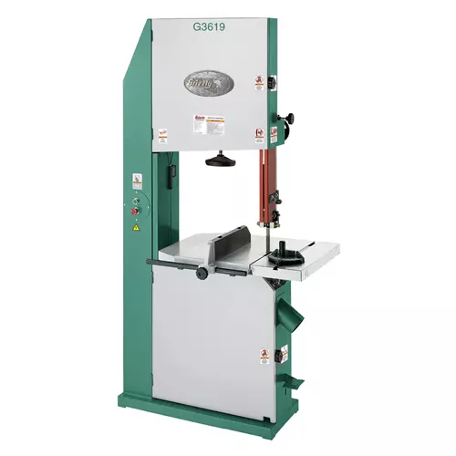 This 900 pound beast can chew through any species of wood that will fit into its 16" vertical capacity, 22-7/8" throat. Dual-belt driven wheels ensure consistent 5200 F.P.M. performance and blades ranging from 1/2" to 2" can be mounted. A strategically placed 4" dust port quickly removes most of the dust generated by the machine. The wheels, fence and 45° tilting table are solid cast iron, a foot brake is provided for quick stops and a blade tensioning scale is mounted for easy front viewing. We have taken considerable effort to ensure that everything about this saw is heavy-duty. If you use it in a production shop, you will not be disappointed.
