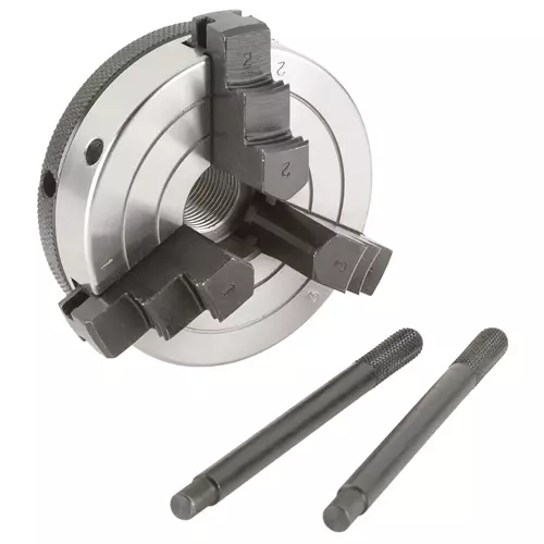 Jaws tighten at the same time and they're reversible. Self-centering.