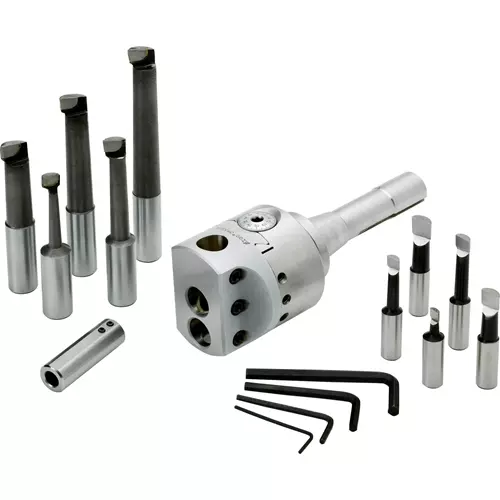 This all-inclusive set features a precision 3" boring head, R-8 shank, five-piece set of 3/4" carbide tipped boring bars, five-piece set of 1/2" HSS boring bars, 1/2" to 3/4" adapter, wrenches and fitted case. Takes 7/16"-20 drawbar.
