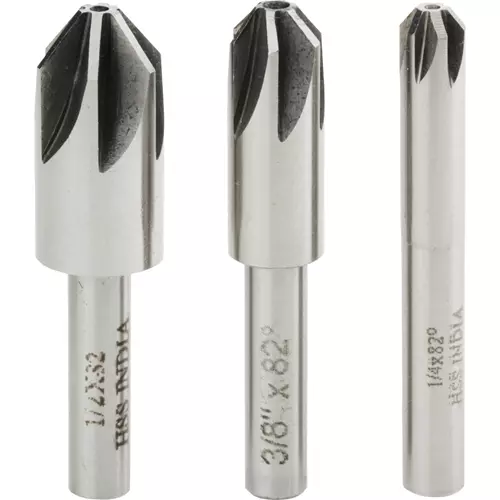 This centerless countersink set features 6 flute, 82° cutting edges and are made of high speed steel. They come supplied with a plastic case and are sized 1/4", 3/8" and 1/2".