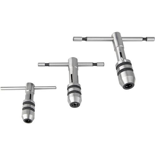 Never be without the correct size Tap Wrench. This 3-pc. set includes T-handle wrenches in the following size ranges: 1/16" - 5/32", 5/32" - 1/4" and 1/4" - 1/2". Knurled collets hold round and square taps and sliding handles provide plenty of torque.