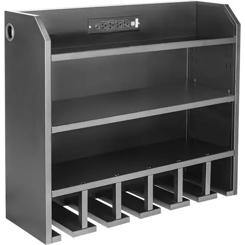 The upper shelf has a 4-outlet surge protector and room for multiple chargers so you can easily keep your batteries charged and out of the way while your tools are being stored.