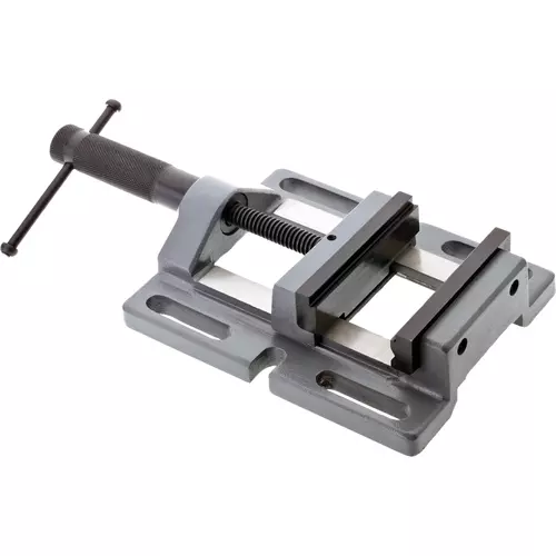 This heavy-duty high tensile cast iron vise has stepped steel jaws with a prismatic fixed jaw for holding round stock horizontal or vertical. The base is precision ground for perfectly flat mounting, and the knurled handle provides quick adjustments. Wide slots make for easy clamping to machine tables—great for precision drilling jobs! Includes a sturdy lip along both sides of the base, allowing vise to be mounted to nearly any machine table, using common T-slot clamps.