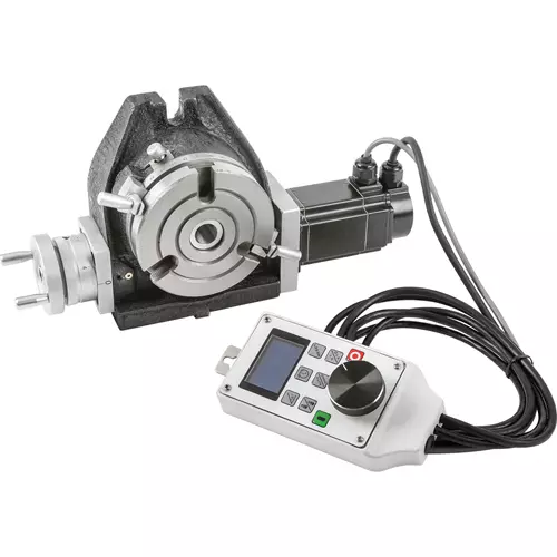 A rotary table allows drilling or cutting at exact intervals around vertical and horizontal axes.