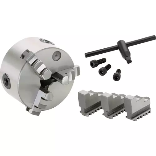 This top quality chuck has a semi-steel body and comes with two sets of hardened jaws. It is self- centering and has plain backs. Requires mounting plates. Through hole: 0.865".