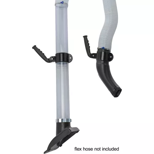 The blast gate opens and closes the dust collection system, and wall mounting clamps allow for out-of-the-way storage.