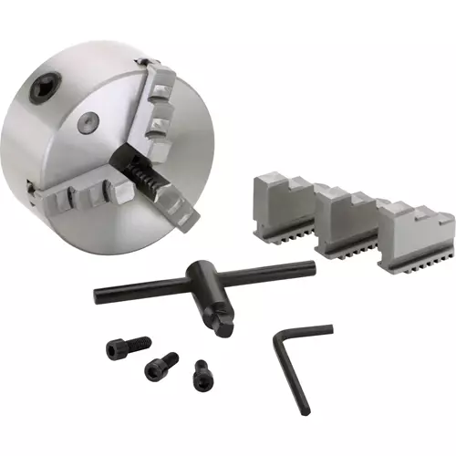 This top quality chuck has a semi-steel body and comes with two sets of hardened jaws. It is self-centering and has plain backs. Requires mounting plates. Through hole: 1.18".