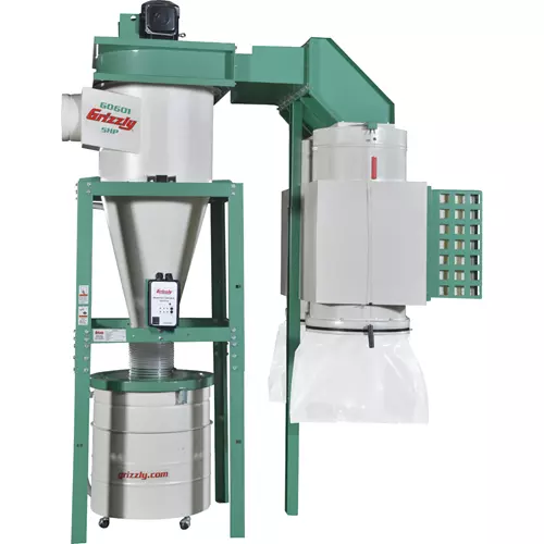 Cyclonic action separates the heavy dust particles from the fine particles and drops them into the 55-gallon steel drum. Any remaining dust travels past the 16" diameter impeller and is then trapped by the cartridge filters. Each cartridge filter is pleated to provide 226 square feet of surface area for efficient air movement and a clear plastic bag collects the fine cake that shakes off the filter for consistent dust collector performance. Casters mounted to the drum also make disposal of the larger chips and dust as easy as it gets. Other features include: a vertical motor support for reduced vibration, thick walled 11 gauge steel blower housing, 14 gauge steel cyclone body, 360 degree blower rotation for easy connection to a duct system, TEFC Class "F" motor, and filter cleaning device. A rugged steel stand is included. Over two years in the making, these cyclone dust collectors are the best in their class - at any price!