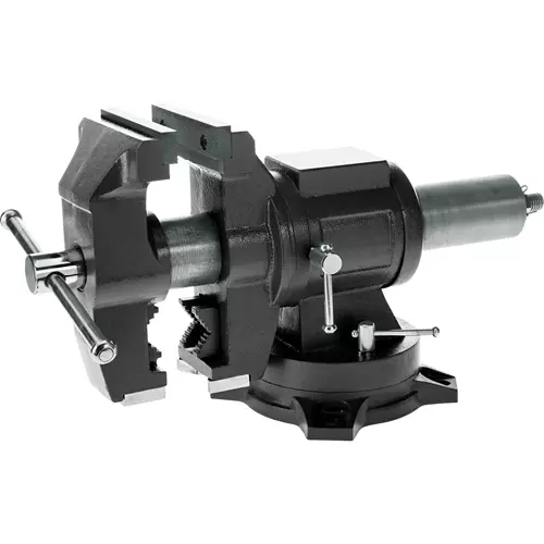This Multi-Jaw Bench Vise is extremely versatile for all wood-holding jobs. Jaws rotate 360° for unlimited workpiece positioning and secures flat stock as well as round stock with the built-in pipe jaws. Vise swivels 360° on its base and there's even an anvil face on top. Jaws measure 5" wide with a 5" maximum opening. Includes 5" aluminum jaw caps.