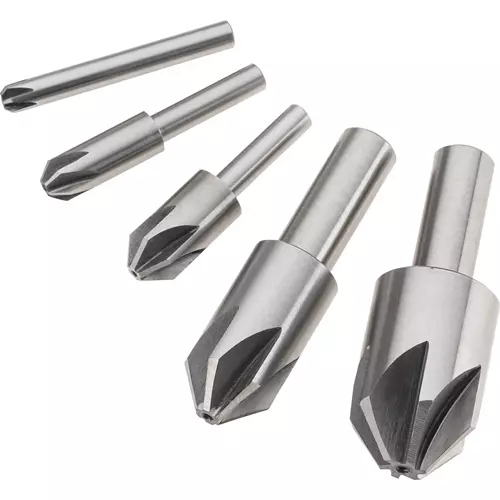 You can expect fine finishes with less cutting pressure from these centerless, high speed steel countersink sets. Choose this 82° set for deburring, chamfering and general countersinking tasks. This set also countersinks for screws! Each set includes these sizes: 1/4", 3/8", 1/2, 3/4" and 1".