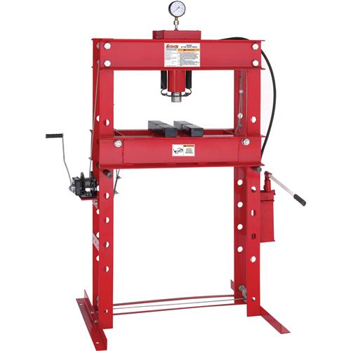 For your toughest shop pressing needs, this 50 Ton Shop Press does it all. Has a built-in pressure gauge~provides exact pressure readings. A hand operated winch raises and lowers the bed, which can be adjusted to any of 6 locations spaced 5-7/8" along its massive steel frame.