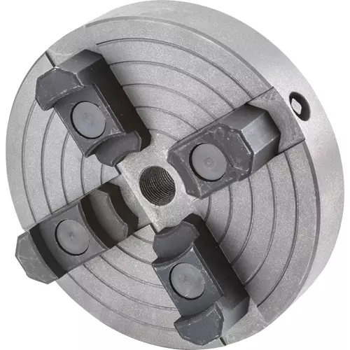 Independently adjustable jaws hold odd shaped work. Jaws can be reversed for different holding applications. Independent jaws.