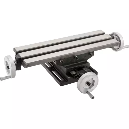 This compound slide table has 7-1/2" cross travel and 12" longitudinal travel and features adjustable gibs, dovetailed ways, Acme screws, and vernier scales. Weighs 63 lbs.