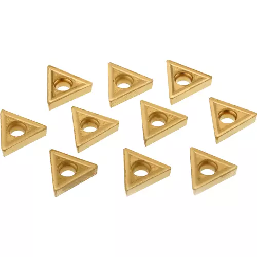 These 60° positive triangle screw-on type inserts are titanium nitride coated C-5 carbide for general purpose machining of steel and steel alloys. Each features single sided chip breaker and 7° relief angle.