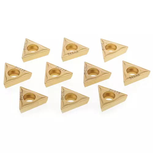 These 60° positive triangle screw-on type inserts are titanium nitride coated C-5 carbide for general purpose machining of steel and steel alloys. Each features single sided chip breaker and 7° relief angle.