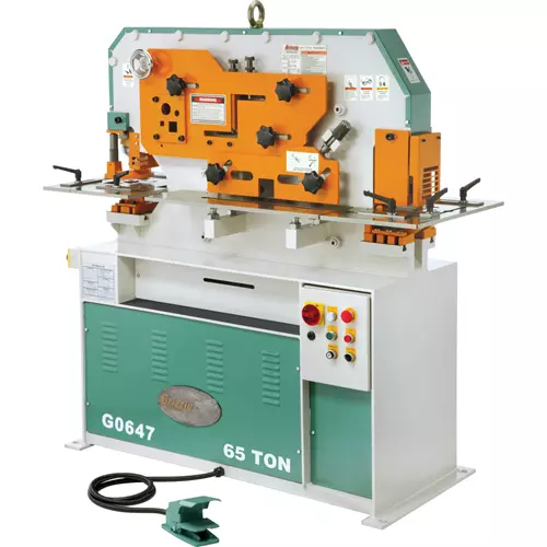 If you fabricate with mild steel, you’ll want one of these Ironworkers working for you. With five independent stations for punching, flat bar shearing, notching, angle cutting & section cutting, you’ll appreciate the convenience & labor savings over traditional methods. A work stop is included for cutting uniform parts to length & a safety foot pedal makes operation extremely easy.