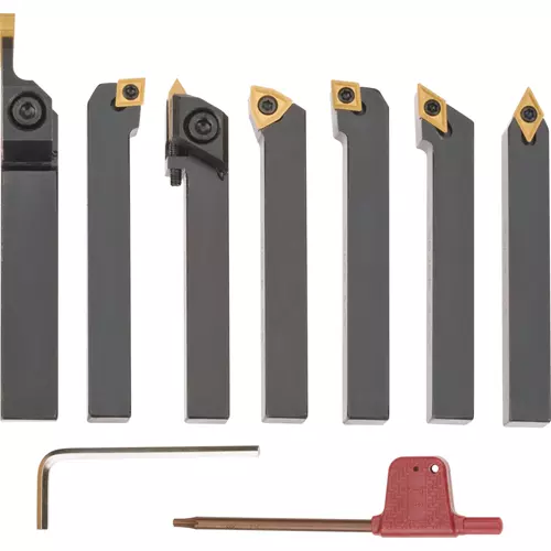 Supplied with right hand and left hand turning/facing tool holders, the set is complimented with one threading and cut-off tool too.