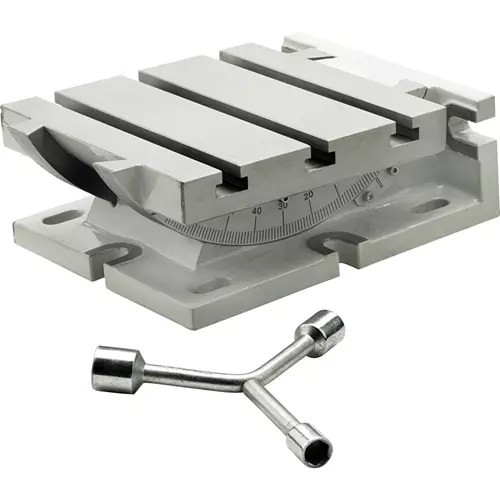 This superior quality Tilting Table can be used horizontally or vertically and features precision milled dovetail trunnions with an easy to read angle setting gauge and 3/8" T-slots that are 2-9/16" on center. Table size is 7-7/8" x 7-13/16" and its low horizontal profile won't gobble up precious vertical capacity. Includes double lock nuts to secure the table position & a 3-way socket wrench. Overall size is 9-1/2"L x 7-7/8"W x 3-1/2"H.