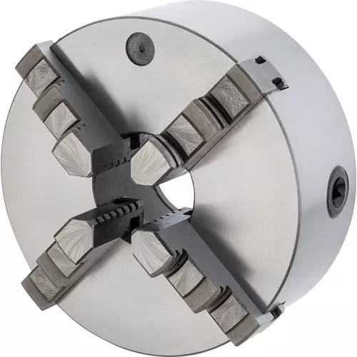 The T32464 8" 4-Jaw Plain Back Scroll Chuck has a semi-steel body and two sets of hardened jaws.